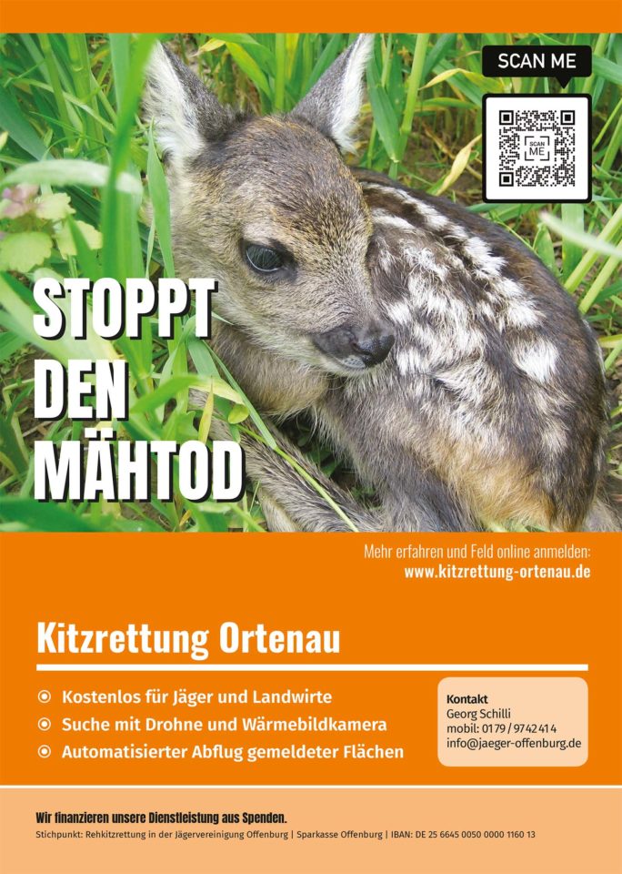 Stoppt den Mähtod! Mit dieser Aufforderung wendet sich die Kitzrettung Ortenau dieser Tage an die Landwirte. Mit Wärmebild-Drohnen sorgen sie bald wieder dafür, dass die erste Mahd der Wiesen keine Opfer fordert. Die Suche ist für Jäger und Landwirte kostenlos. Anmelden können die Landwirte ihre Flächen schon jetzt – auch ohne konkreten Einsatztermin.