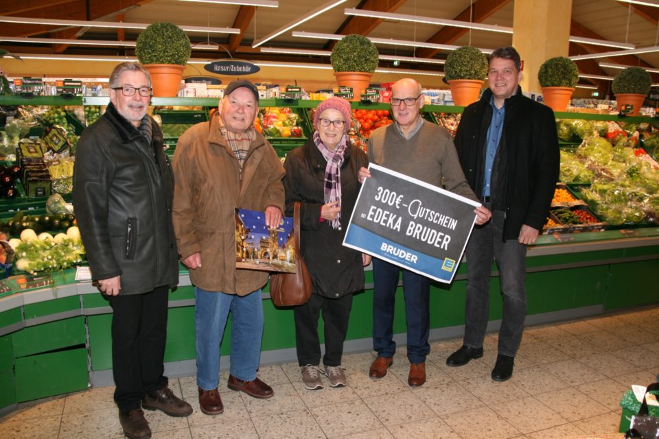 Am vergangenen Freitag wurde der Hauptpreis der diesjährigen Lions-Aktion in der Weihnachtszeit überreicht. Berthold und Waltraud Schmetzer erhielten aus der Hand von Alois Bruder, Geschäftsinhaber des Zeller Edeka-Markts, einen Einkaufsschein in Höhe von 300 Euro.