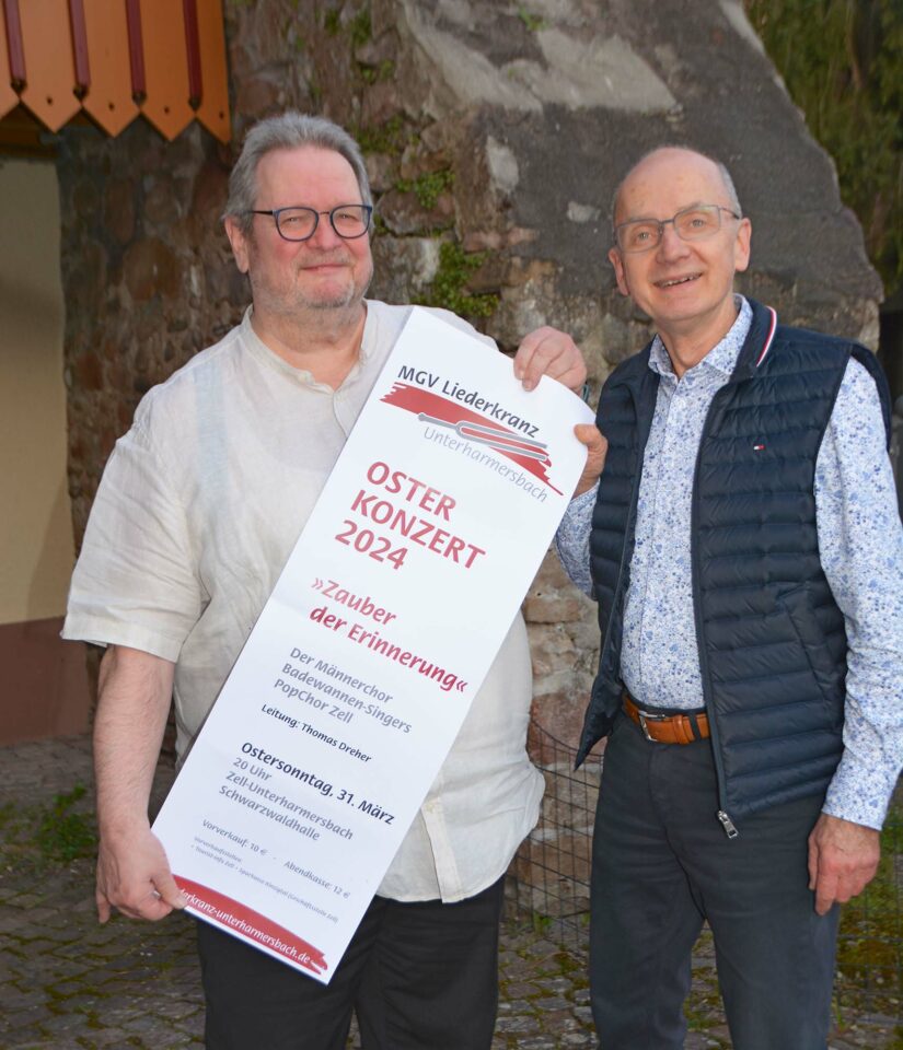 Im Rahmen des Osterkonzerts konnten die beiden Tenorsänger Fridolin Schwendemann und Hildebert Gieringer geehrt werden. Seit 40 bzw. 65 Jahren sind sie im Männerchor Unterharmersbach aktiv.