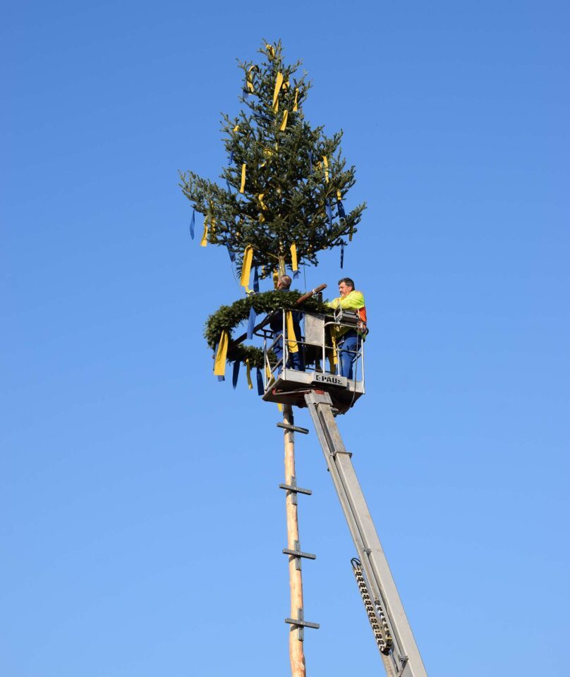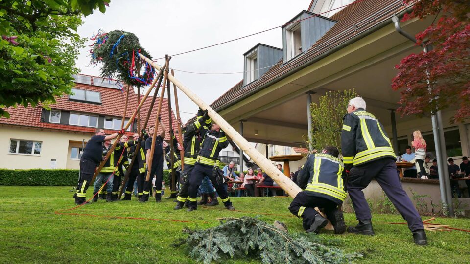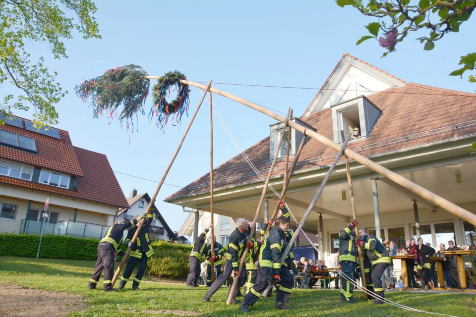 14 Feuerwehrmänner stellten den Maibaum mit Muskelkraft auf. Seit mehr als 25 Jahren wird diese Tradition im Dorf gepflegt.