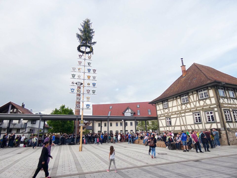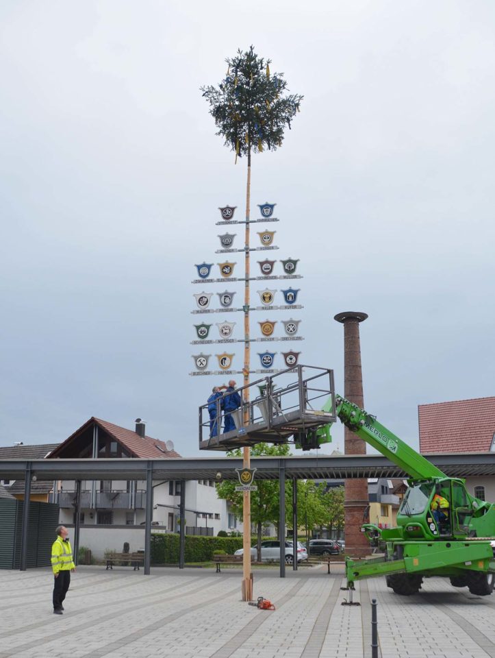 Am frühen Sonntagabend ist der Maibaum wie vorgesehen in die für ihn vorgesehene Hülse vor dem Rathaus gerutscht. Zimmermänner hatten ihn mit reiner Muskelkraft aufgerichtet, was hunderte Besucher beklatschten und im Anschluss beim großen »Mai-Fescht« auf dem Rathausplatz begossen.