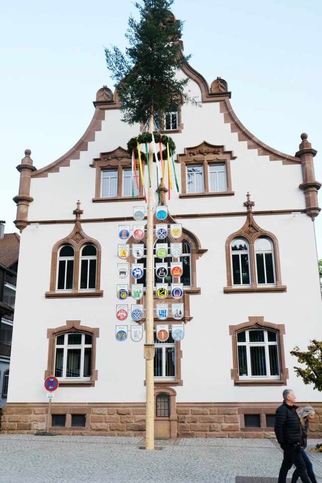 Zum elften Mal schmückt ein Maibaum das Oberharmersbacher Rathaus. Beim Aufstellen am Samstag lief alles wie am Schnürchen. Hunderte Zuschauer schauten beim Spektakel zu und feierten anschließend ein rauschendes »Mai-Fescht« auf dem Rathausplatz.