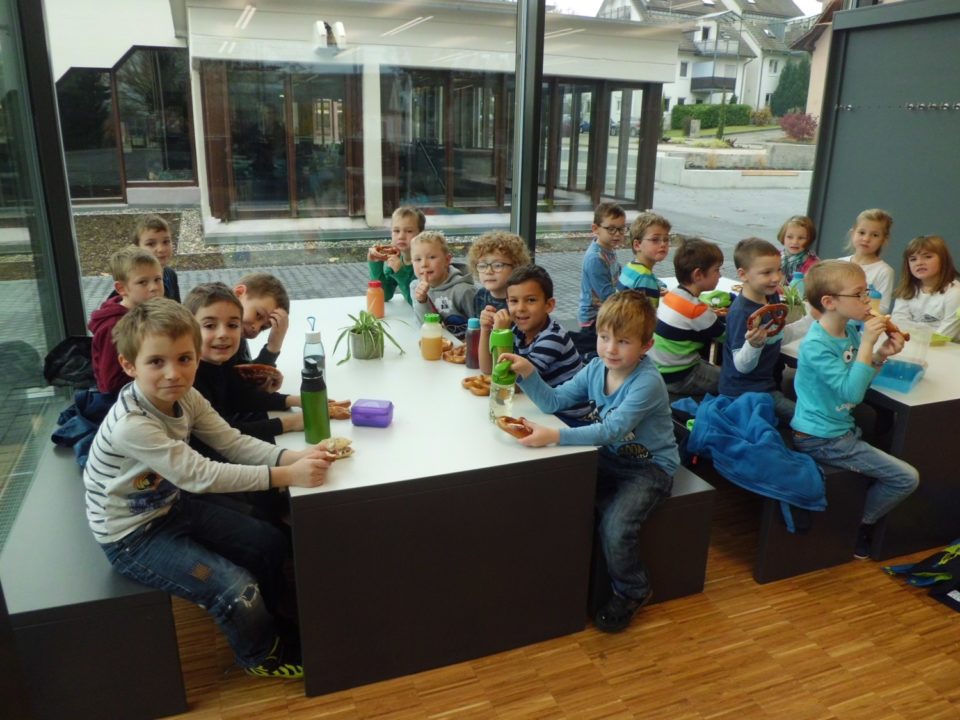 Die Schüler der Grundschulförderklasse erkunden zusammen mit ihrer Lehrerin Patricia Lehmann die neue Mensa des Bildungszentrums Ritter von Buß. Nachdem sich jedes Kind eine Brezel kaufen durfte, wurde noch gemeinsam in der Mensa gegessen. Allen gefiel es sehr gut und an einem so schönen Tisch schmeckt’s allen nochmal so gut.