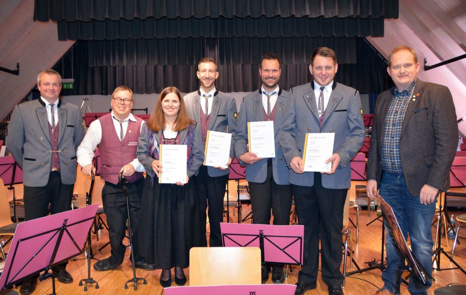 Blasmusikverband ehrt vier Silberjubilare des Musikvereins Unterentersbach. Außerdem ehrt der Verein zwei Musiker für 30 Jahre aktive Mitgliedschaft.