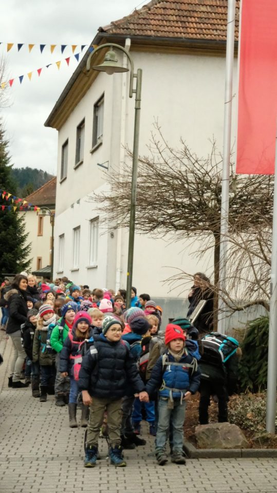 In Zweierreihen ging es am Mittwoch um fünf vor zwölf für die 138 Kinder der Grundschule Biberach zum Peterlesspringen. Schließlich wollte man pünktlich zum Mittagsläuten an der Sparkasse sein.