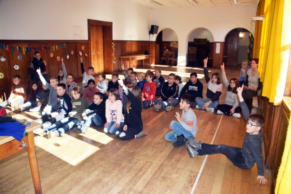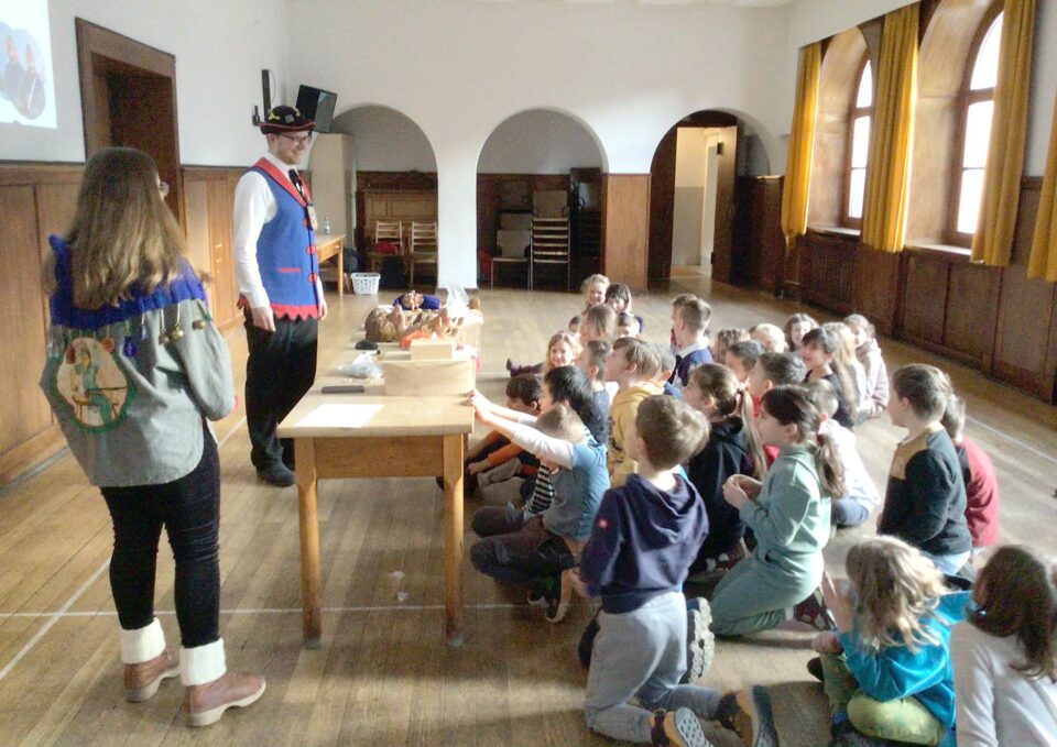 Am Montagmorgen hatten die Grundschüler ein besonderes Erlebnis: Zunftmeister Stefan Haas und Glas hansel Angela Kiesel unterrichteten sie in der Turnhalle der Grundschule über das närrische Brauchtum in Nordrach.