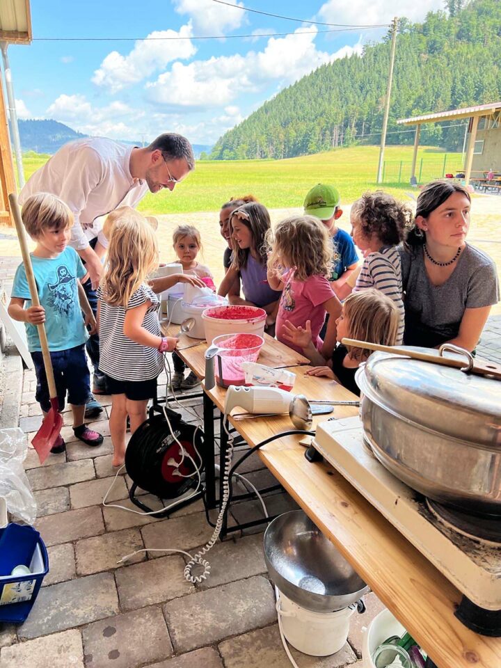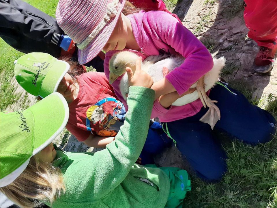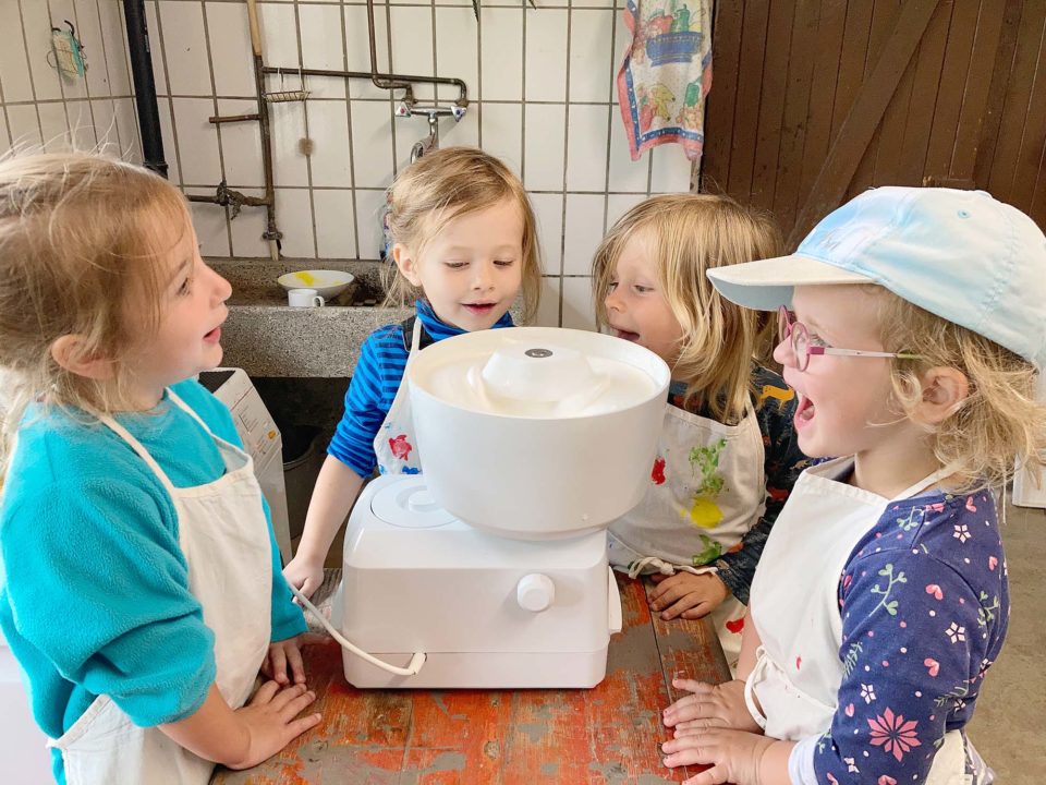 Alle zwei Wochen statten die Biberacher Naturkinder dem Wiedmer-Hof im Bruch einen Besuch ab. Sie helfen dort bei dem mit, was auf dem Hof an Arbeit anfällt. Beim letzten Bauernhoftag durften die Kinder endlich die frisch geschlüpften Küken bestaunen und zart schmelzendes Eis aus zuckersüßen, frischen Erdbeeren machen.