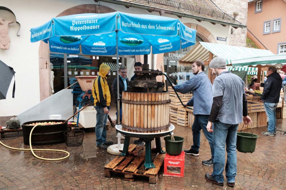 Neuhauser Mostfest beim Städtle-Markt findet erneut großen Anklang. Beim Trotten nach alter Väter Sitte schauen die Marktbesucher immer wieder gerne zu.