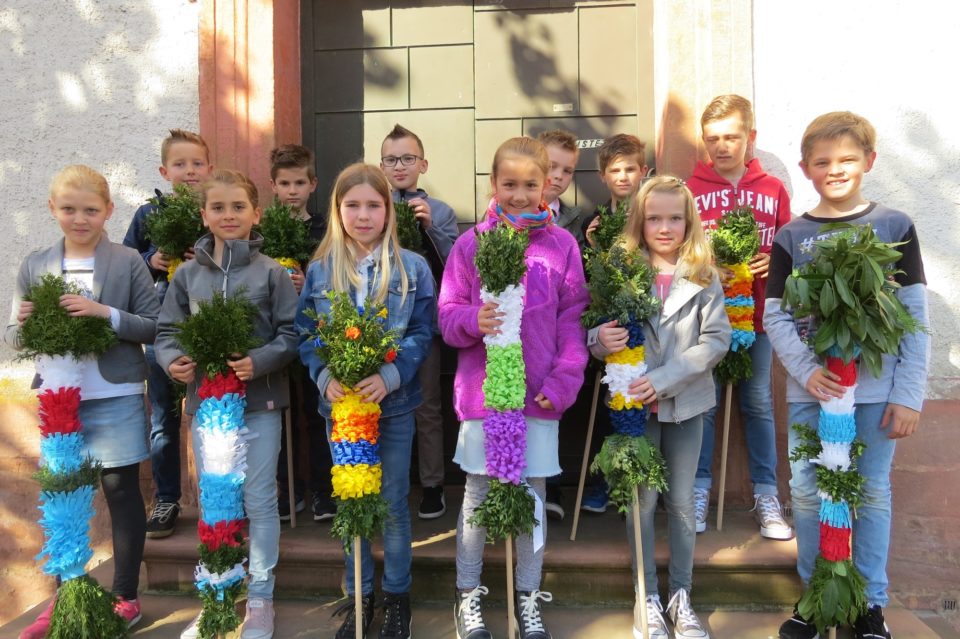 Die meterhohen Palmen an der Kirchenmauer sind jedes Jahr wieder ein beeindruckendes Bild. Die größte Palme ist 14 Meter hoch und überragt sogar das Kirchendach. Die Kommunionkinder haben eigene Palmen gebunden und dekoriert. Pfarrer Bonaventura Gerner konnte zum Festgottesdienst eine große Zahl Gemeindemitglieder begrüßen.