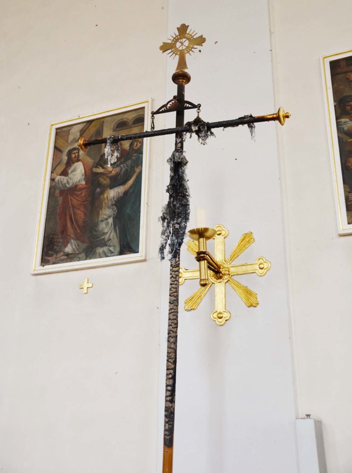 Am späten Montagnachmittag haben Unbekannte in der Stadtpfarrkirche die Symphorians-Fahne in Brand gesetzt und damit erheblichen materiellen und ideellen Schaden angerichtet.