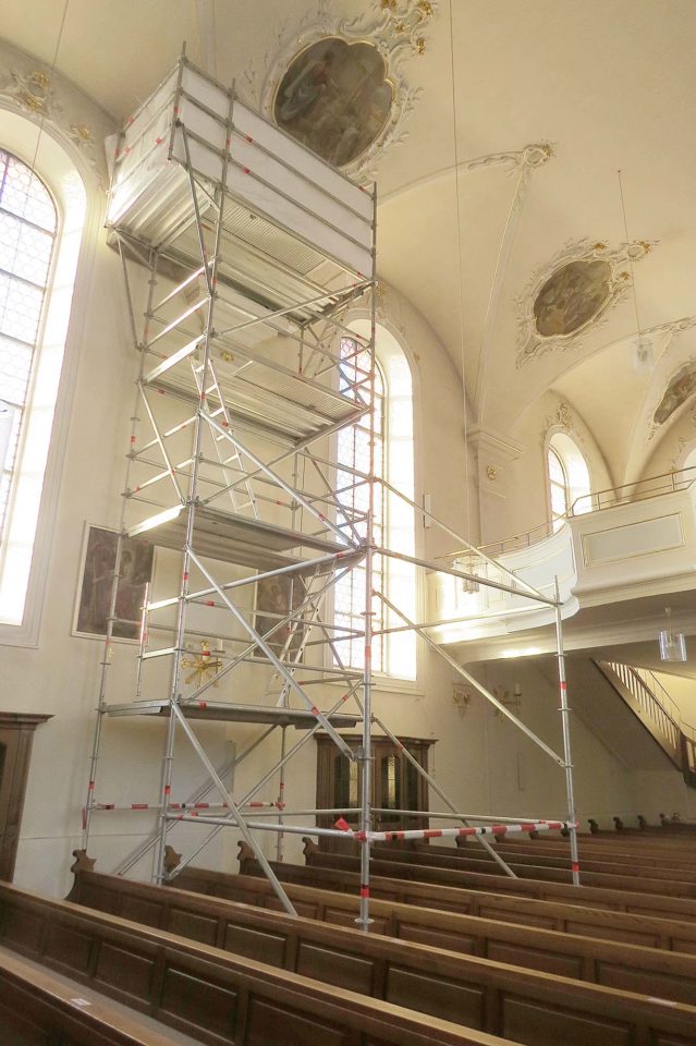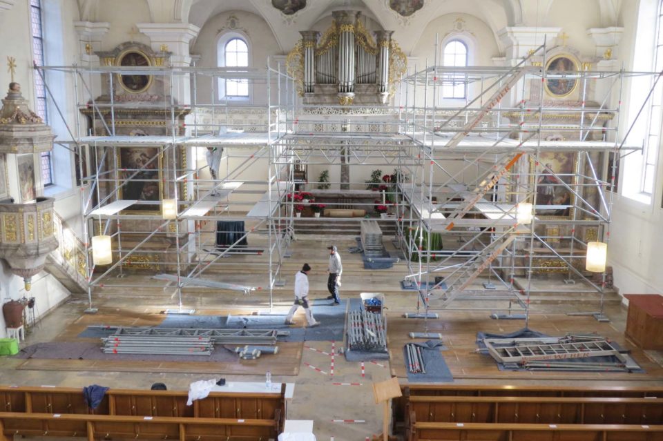 Ein weiteres Gerüst wurde in der Pfarrkirche seit Anfang der Woche aufgebaut. Ein schon vor längerer Zeit festgestellter Wasserschaden hat zu sichtbaren Folgen an der Decke oberhalb der Fensterreihe geführt. Handwerker sind zurzeit dabei, die Schäden zu beheben.