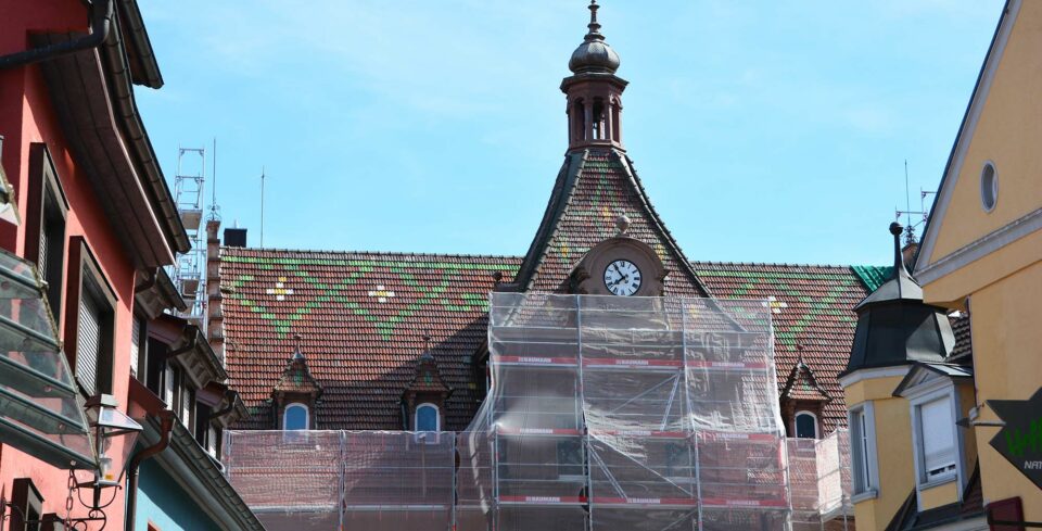 Rund 75 bis 85 Prozent der Ziegel auf dem historischen Rathaus weisen teils erhebliche Schäden auf und müssen im Zuge der Sanierung ersetzt werden. Die glasierten, teils farbigen Doppelmulden-Falzziegeln sind jedoch nicht mehr im Handel erhältlich, sondern müssen als Sonderanfertigung hergestellt werden.