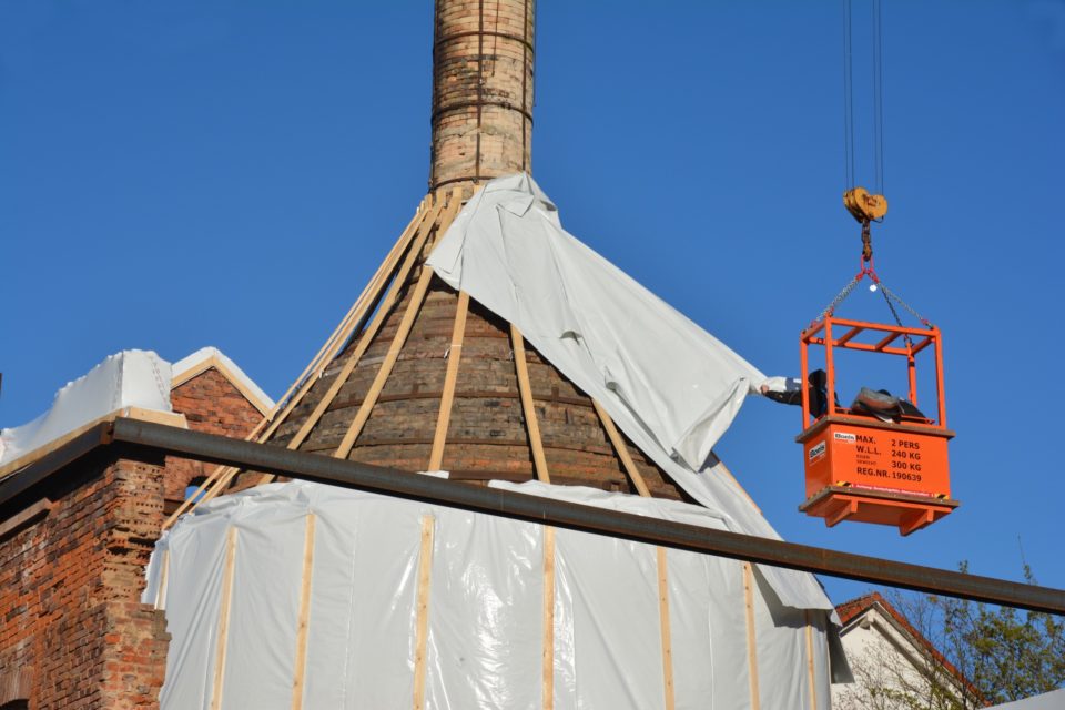 Die Sanierung des Rundofens auf dem Gelände der Oberen Fabrik geht Stück für Stück voran. Aktuell erhält das Industriedenkmal sein neues Dach. Es ist keine einfache Arbeit für die Zimmerleute der Firma Rombach, denn die Arbeitshöhe beträgt beträchtliche 22 Meter.