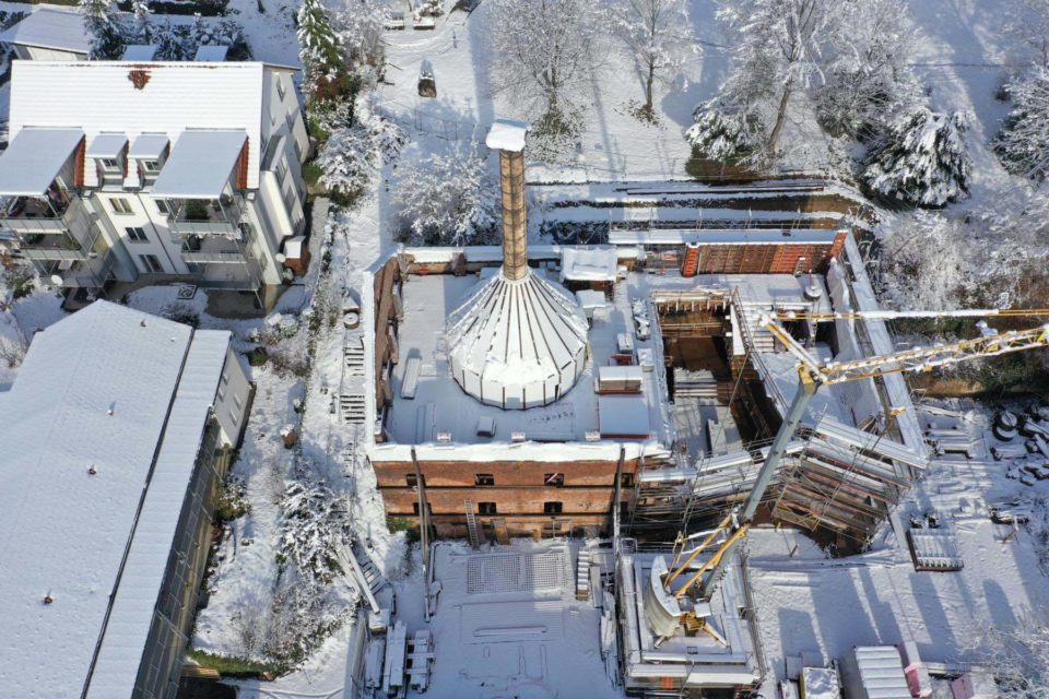 Der Winter hat auch die Baustelle des historischen Rundofens in sein weißes Kleid gehüllt. Dennoch gehen die Arbeiten auf derzeit Zells zweitgrößter Baustelle weiter. Auch die Vorbereitungen für die künftige Vermarktung des Areals »Obere Fabrik« schreiten voran.