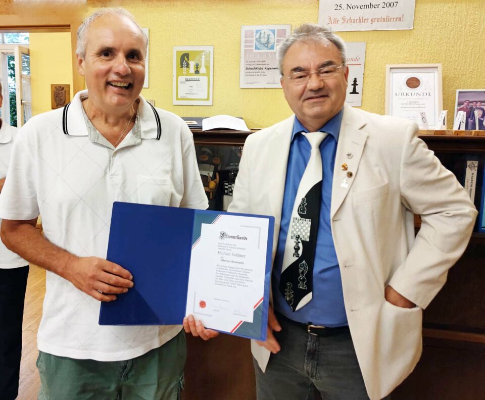 Michael Vollmer vom Badischen Schachverband mit der silbernen Ehrennadel geehrt
