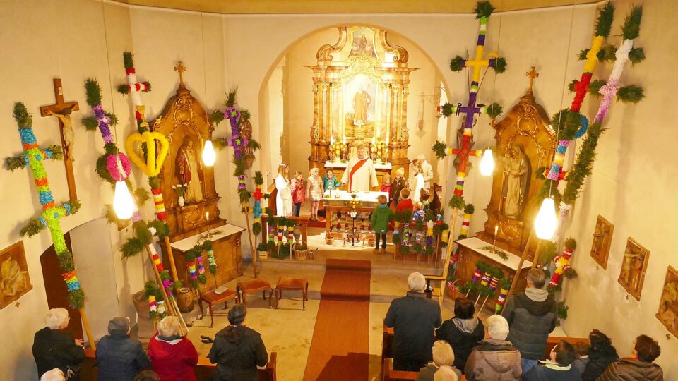 Die Tradition des Palmenbindens bleibt in Unterentersbach lebendig. Diakon Matthias Hoppe hat eine stattliche Anzahl von großen und kleinen Palmen am Vorabend des Palmsonntages geweiht.