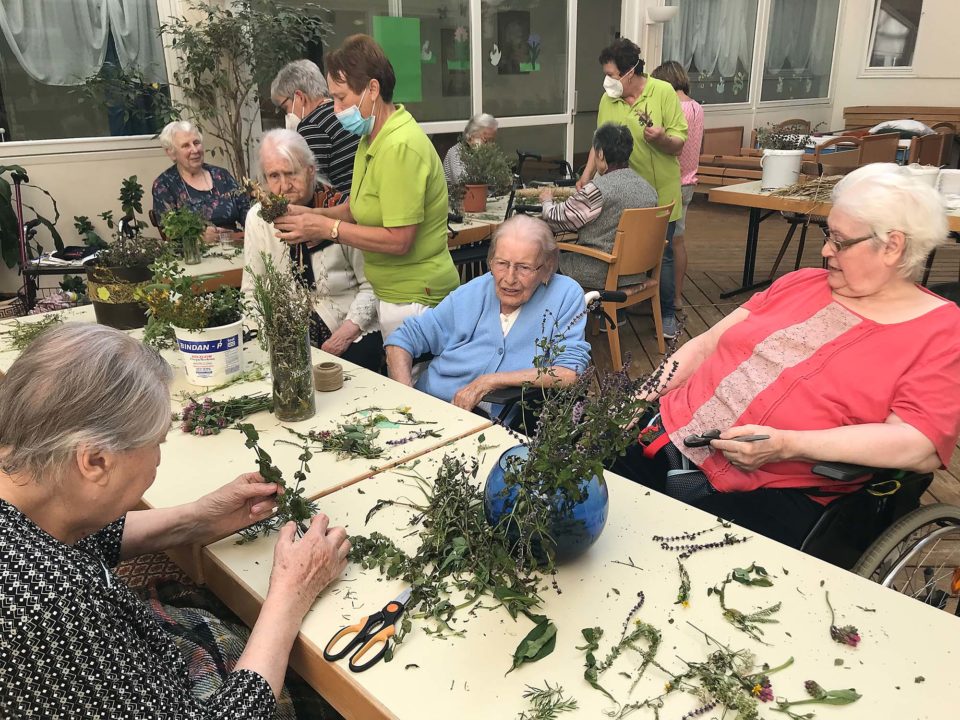 Mit großer Freude nehmen die Bewohner des St. Gallus-Altenpflegeheims gemeinsame Angebote wahr, die nun wieder eingeschränkt möglich sind. So war das Kräuterbüschelbinden für Mariä Himmelfahrt ein ganz besonderer Höhepunkt, der bei den Teilnehmerinnen viele Erinnerungen weckte.