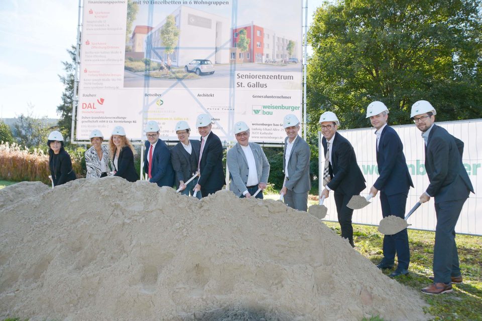Bei strahlendem Sonnenschein konnte am Freitagvormittag mit dem symbolischen ersten Spatenstich der Ersatzneubau für das Seniorenzentrum St. Gallus begonnen werden. Binnen zwei Jahren entsteht direkt neben dem Bestandsgebäude ein neues 90-Betten-Haus, das den Vorgaben der Heimbauverordnung entspricht und in dem künftig die Bewohner in Einzelzimmern untergebracht sind. Das Investitionsvolumen beträgt rund 14 Millionen Euro.