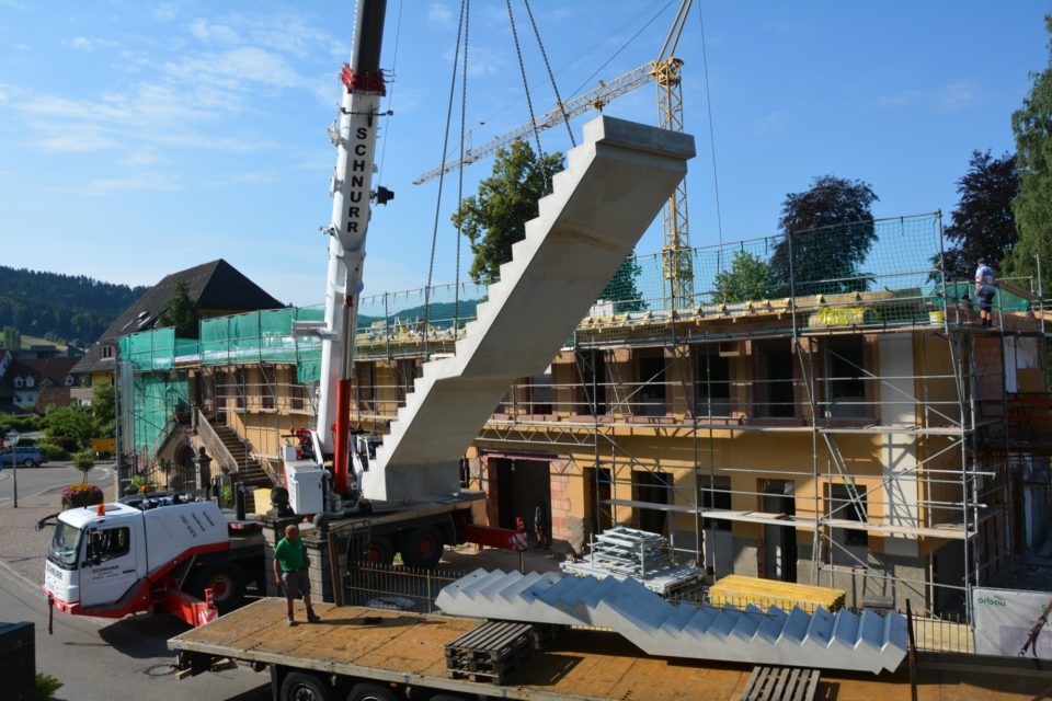 Die Sanierung des Untertorgebäudes geht planmäßig voran. Gestern wurden zwei massive Treppenelemente eingebaut, die künftig das Obergeschoss und das Dachgeschoss erschließen.