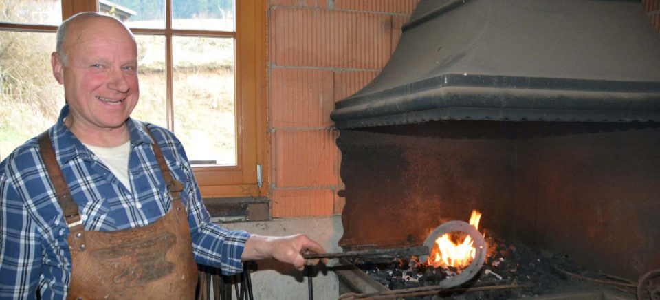 Kunstschmiedemeister Rolf Vitt schmiedet das heiße Eisen. Vier Hufeisen hat er in Form eines vierblättrigen Kleeblatts fest miteinander verbunden.