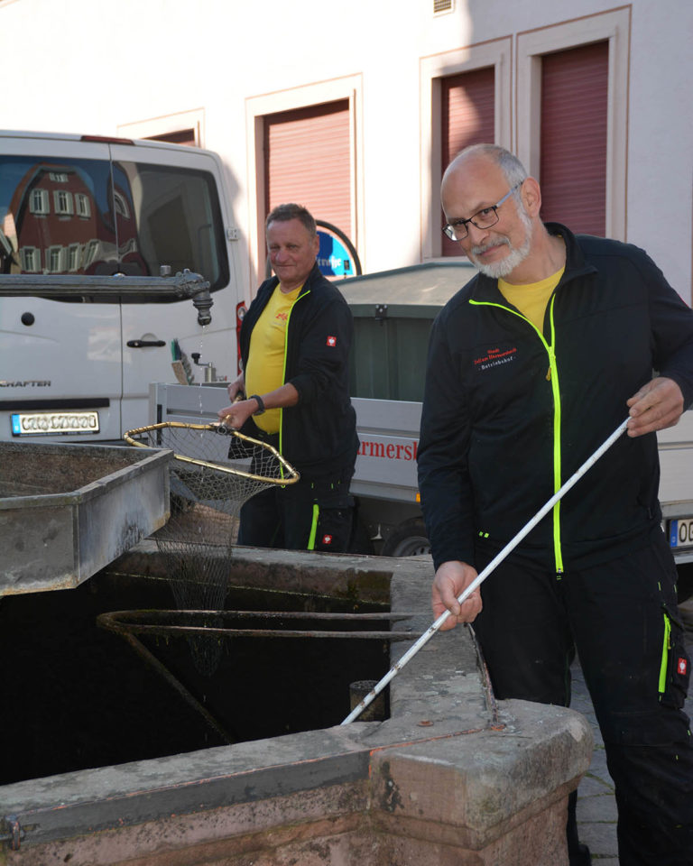 Nachdem alle vorbereitenden Maßnahmen getroffen waren, haben am Mittwoch Steinmetzmeister Werner Göhrig und seine Mitarbeiter damit begonnen den Stadtbrunnen komplett abzubauen. Jetzt wird das Baudenkmal saniert, im Steinmetzbetrieb in Lahr-Reichenbach zwischengelagert und nach Fertigstellung des Rathaus-Neubaus – voraussichtlich Anfang 2024 – wieder am angestammten Platz aufgebaut.