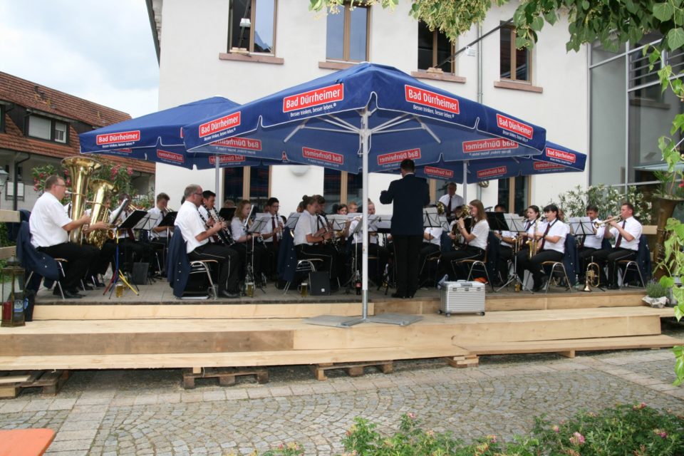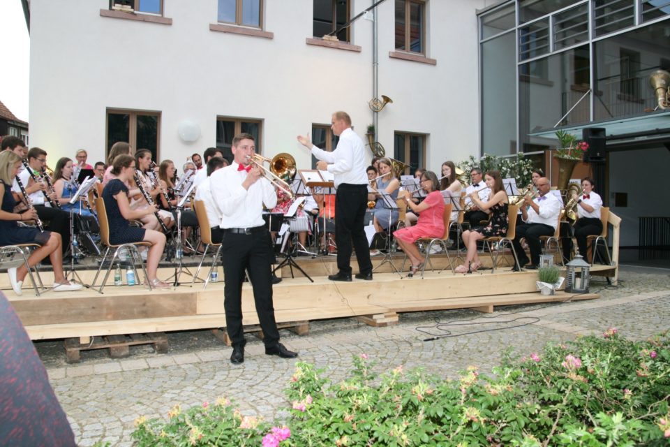 Am Samstagabend lud die Stadtkapelle zum Sommerfest beim Kulturzentrum ein. Trotz unsicherer Witterung war der Platz pünktlich zum Konzertbeginn reichlich gefüllt. Begrüßt wurden die Gäste von den beiden Moderatoren Amelie Dreher und Adrian Schmider, die mit ihren Skizzen die Hintergründe der Kompositionen erläuterten.