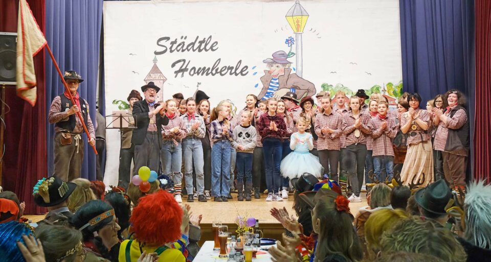 Der Städtleabend ist aus der Corona-Pause zurück und hat am Samstagabend das Publikum wieder mitgerissen: mit einer ungewöhnlichen Idee für eine neue, alte Dienstleistung, Geschichten aus dem Rathaus, der Homberlebonk und von Auftritten vom großen und vom kleinen Ballett. Außerdem hat das Oberhomberle endlich den Ehrungsstau der letzten Jahre aufgelöst.