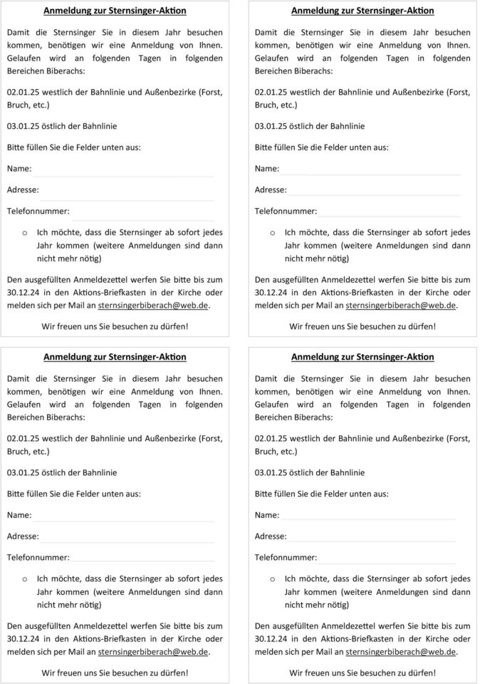 Die Aktion „Sternsinger 2024“ steht an. Im neuen Jahr werden wieder Kinder für drei Tage unterwegs sein, um für die Aktion zu sammeln. Wer hätte Interesse diese Aktion zu unterstützen?