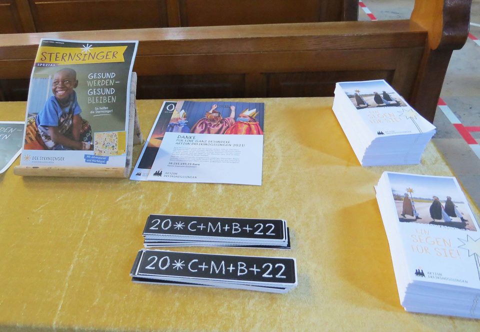 Seit Sonntag liegt die Sternsingerpost in den Kirchen zur Mitnahme aus. Im Gottesdienst segnete Pfarrer Gerner die Segensaufkleber für die Haustüren, die jeder Besucher mitnehmen und an die eigene Haustür anbringen kann.
