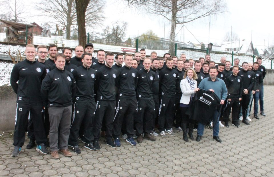 Dass sich die Aktiven, Trainer und Betreuer des SVO in einem neuen Outfit präsentieren können, ist Andy Leopold und Partner von der SV Sparkassenversicherung zu verdanken. Seine großzügige Unterstützung ermöglichte es, einen Funktionspullover anzuschaffen, den Nicole Kälble und Markus Fautz (vorne) präsentieren. Der Verein dankt dem großzügigen Sponsor.