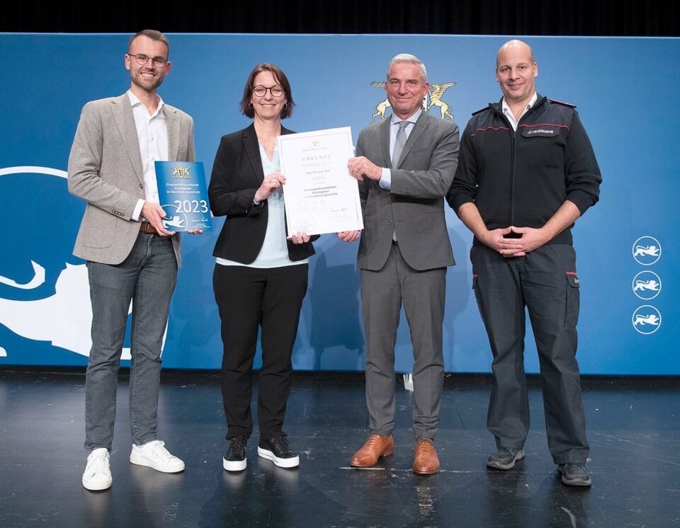 Innenminister Thomas Strobel verleiht dem Biberacher Unternehmen die Auszeichnung „Ehrenamtsfreundlicher Arbeitgeber im Bevölkerungsschutz“.