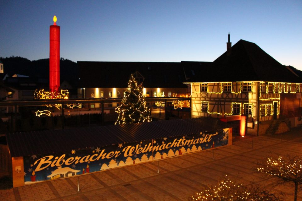 Die zahlreichen Kerzen sorgen für einen herrlichen Lichterglanz und eine wunderschöne und stimmungsvolle vorweihnachtliche Atmosphäre in Biberach. Der kleine aber romantische Biberacher Weihnachtsmarkt unter der Riesenkerze beginnt am Sonntag, 2. Dezember 2018, ab 13.00 Uhr. Er wird anschließend an den folgenden Freitagen im Advent fortgesetzt.