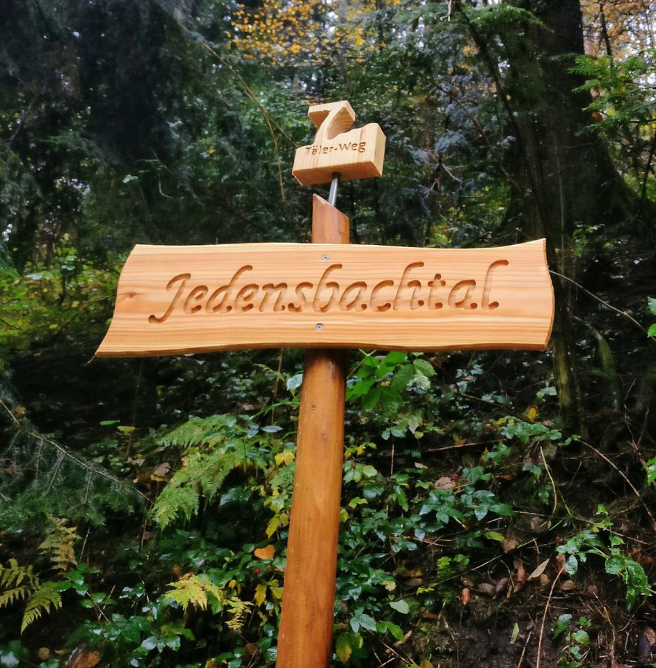 Unterwegs im Jedensbachtal in Oberharmersbach kann derzeit nicht nur die bunte Blätterpracht genossen werden, auch eine neues Schild erregt hier Aufmerksamkeit.