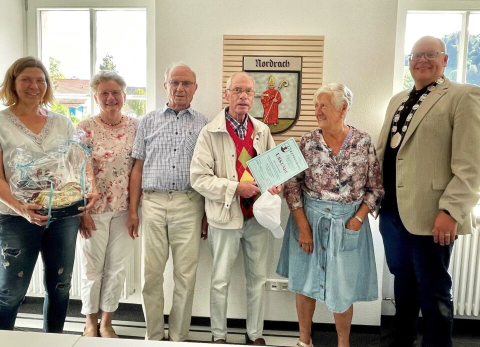 Familie Borchert hat schon ein Jahr ihres Lebens als Urlauber in Nordrach verbracht. Das besondere Jubiläum wurde von der Gemeinde und den Gastgebern Rita und Engelbert Lehmann gebührend gefeiert.