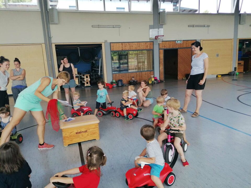 In der Abschlussstunde vor den Sommer ferien durften die Kinder der Eltern-Kind-Turngruppe ihre Bobby-Cars und andere Rutschfahrzeuge mit in die Turnhalle bringen.