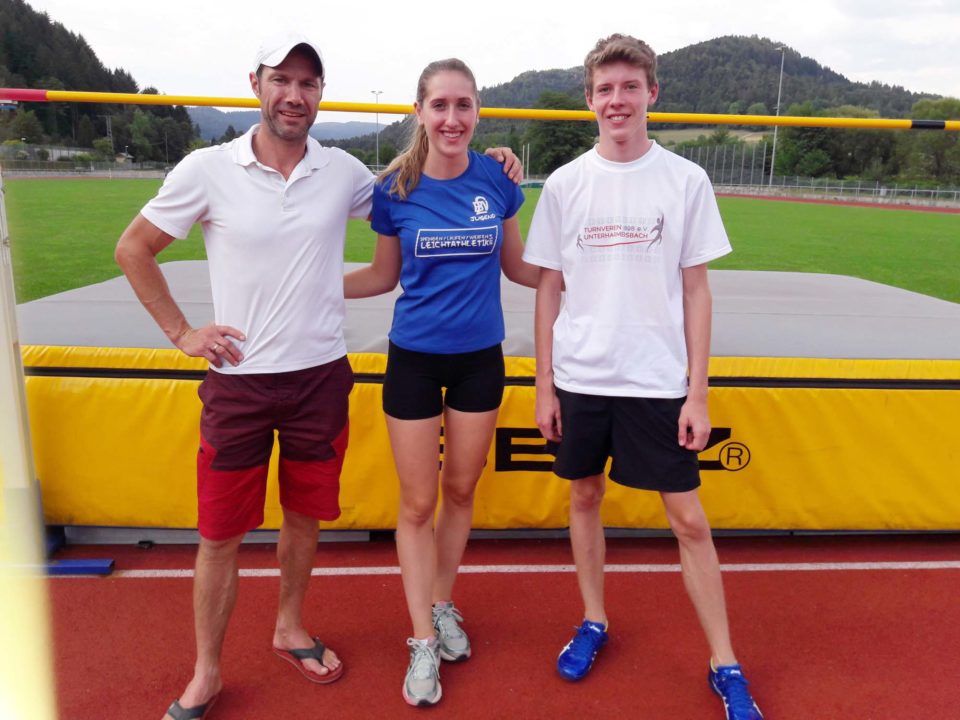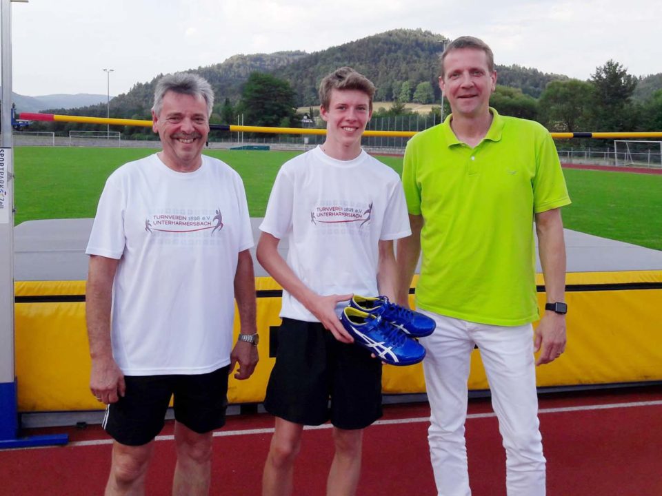 In der Vorbereitung auf die Süddeutschen Meisterschaften freut sich Tim Lehmann gemeinsam mit Willi Lehmann, Abteilungsleiter Leichtathletik TVU, über neue Hochsprungschuhe. Möglich wurde das durch die Unterstützung von Max Bergsträsser von der Apotheke am Kurgarten in Unterharmersbach.