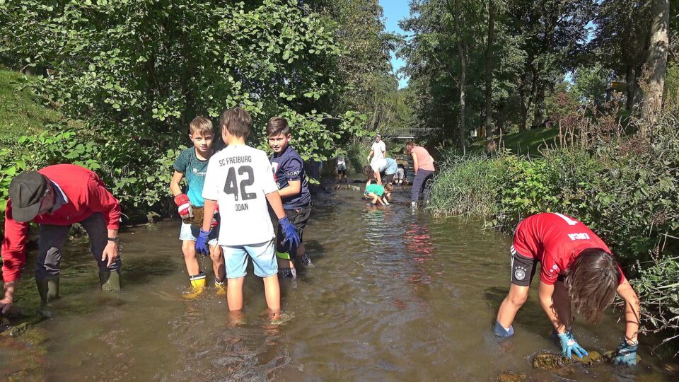 Eltern und Kinder haben ausprobiert, wie Wurfbuhnen die Strömung in der Nordrach verändern.