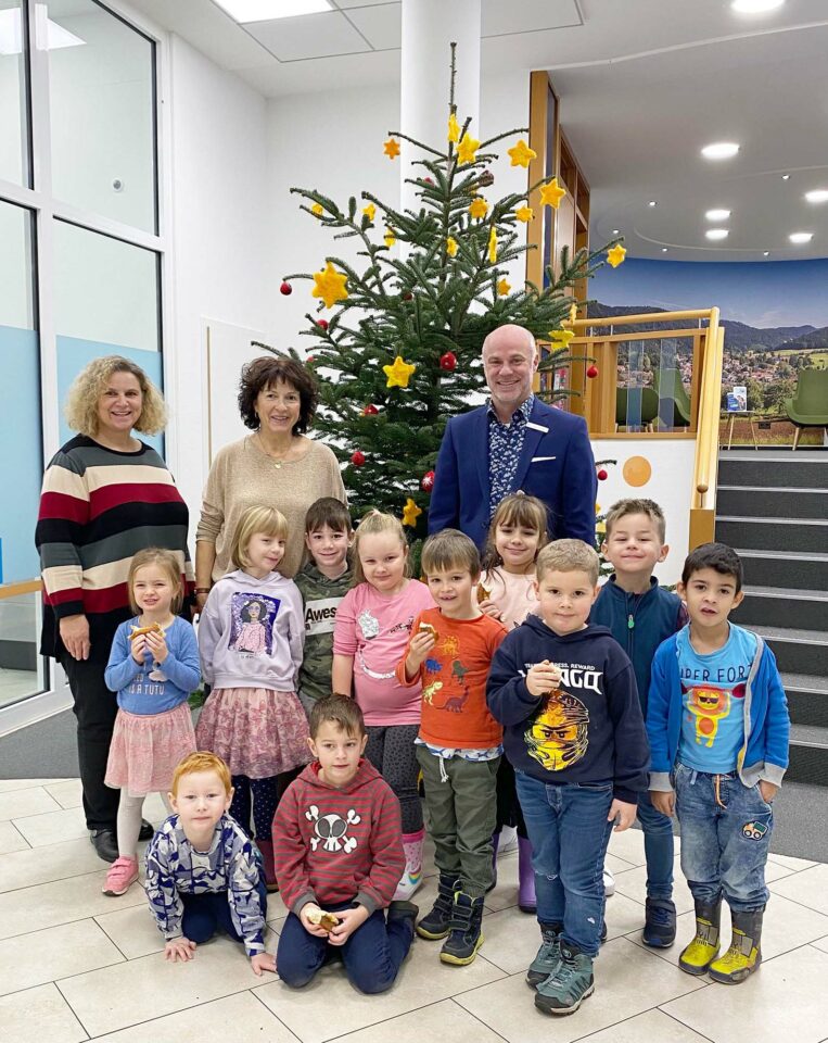 Die Kinder des Kindergartens »Sternschnuppe« schmückten den Christbaum im Zeller Volksbank-Kompetenzcenter.