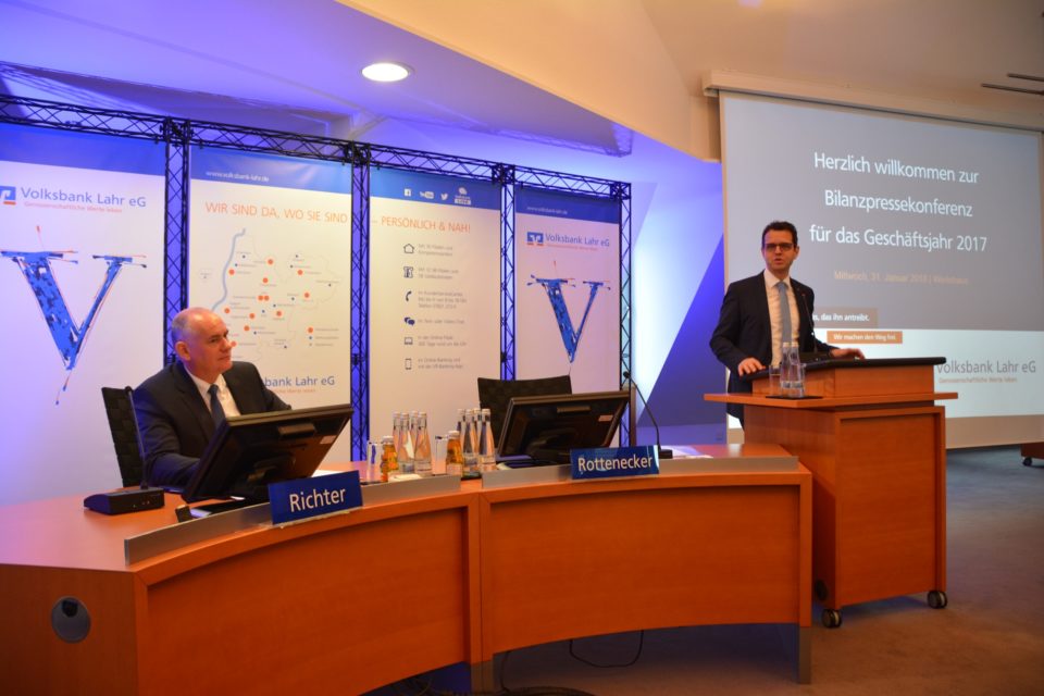 Bei der Vertreterversammlung der Volksbank Lahr informierte der Vorstand über die Arbeit des Jahres 2017. Trotz anhaltender Niedrigzinsphase zeigten sich Vorstandsvorsitzender Peter Rottenecker und sein Vorstandskollege Reiner Richter mit dem Jahresergebnis zufrieden.