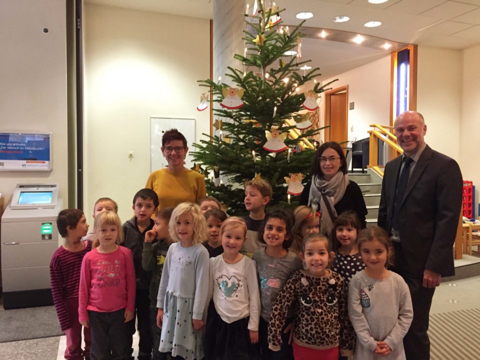 Kindergartenkinder schmücken den Christbaum in der Volksbank Zell