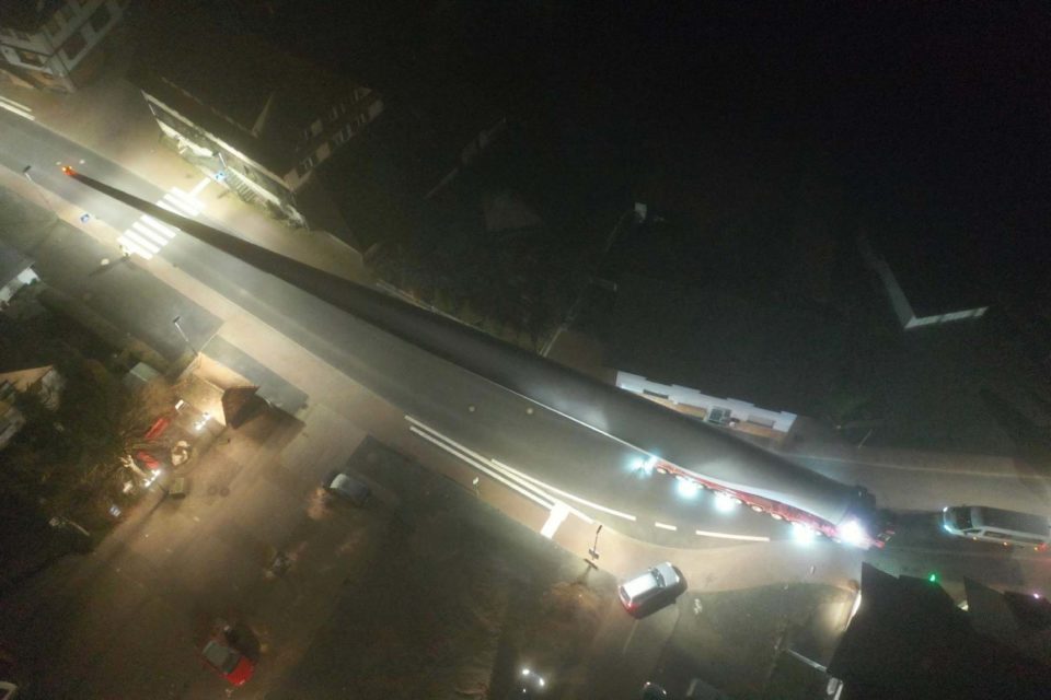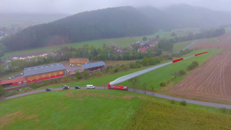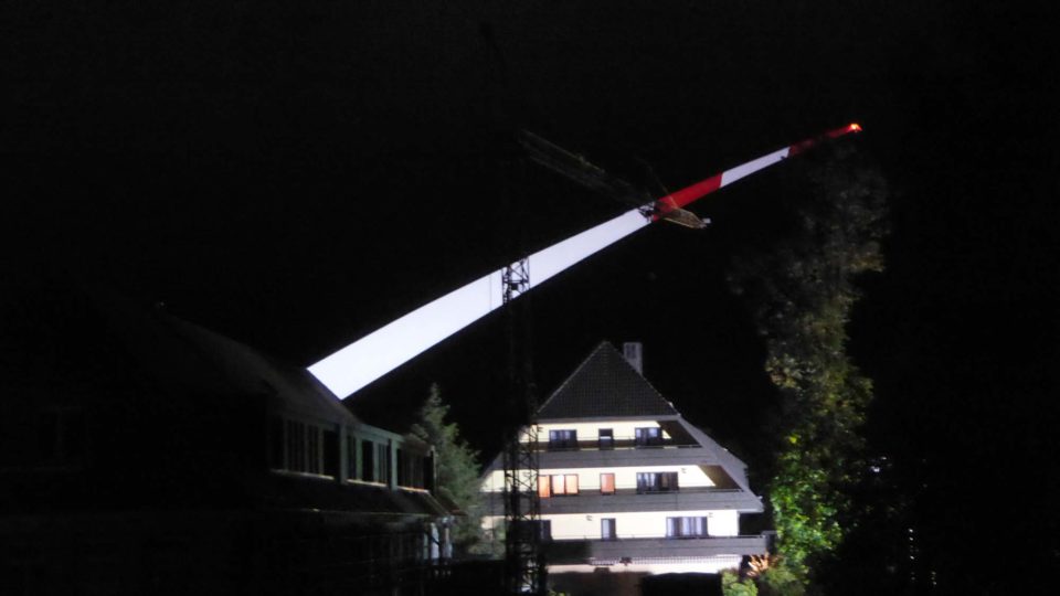 Die Großtransporte auf den Hohenlochen haben begonnen und das erste Rotorblatt ist am 30. September bereits heil auf dem Berg angekommen. Am gestrigen frühen Donnerstagmorgen konnte die zweite Fahrt erfolgen.
