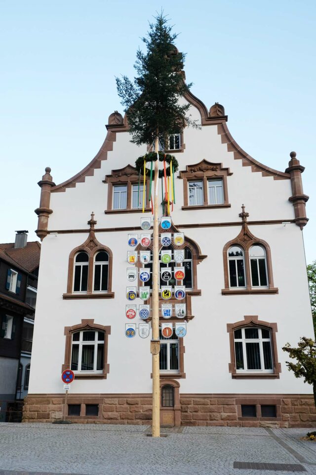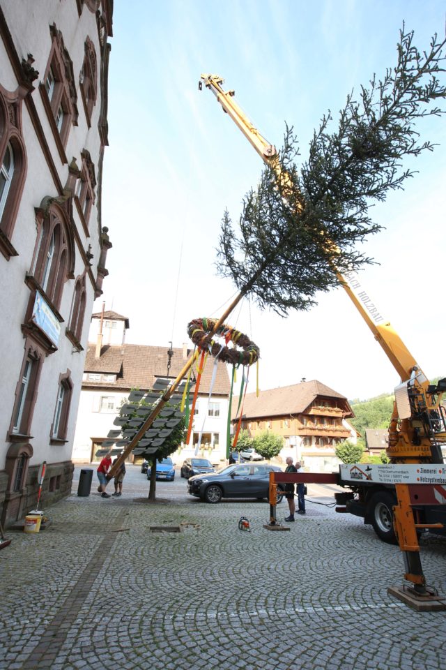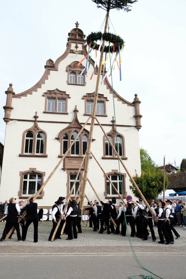 Zum elften Mal schmückt ein Maibaum das Oberharmersbacher Rathaus. Beim Aufstellen am Samstag lief alles wie am Schnürchen. Hunderte Zuschauer schauten beim Spektakel zu und feierten anschließend ein rauschendes »Mai-Fescht« auf dem Rathausplatz.