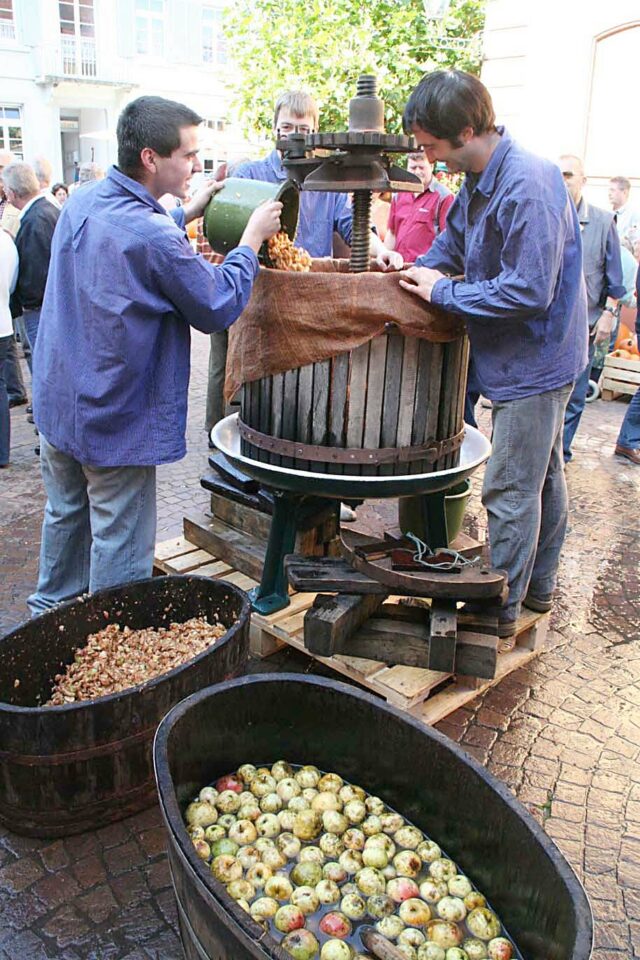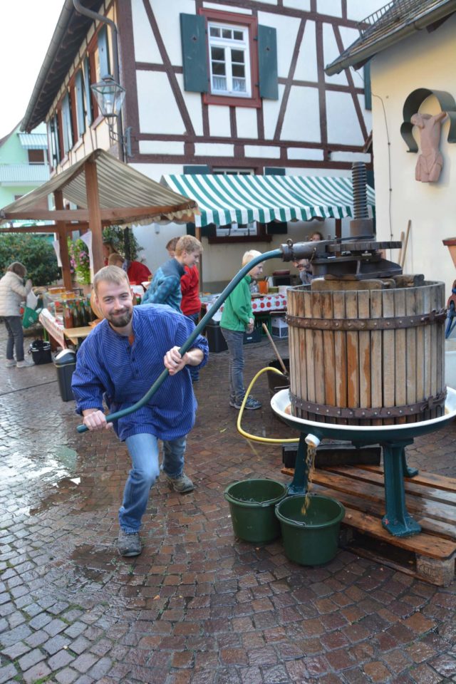 Die Neuhauser Narren sind eine eingeschworene und aktive Gemeinschaft. Beim Städtlemarkt am Samstag haben Gemeinschaftsführer Klaus Kienzle und seine aktiven Helfer zum Mostfest eingeladen. Bereits zum 12. Mal zeigten sie den Marktbesuchern, wie früher Most getrottet wurde und was man alles Feines aus Äpfeln machen kann.