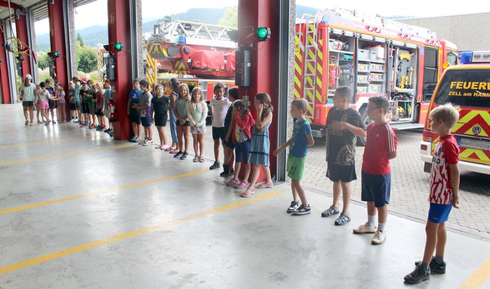 Großes Gefährt fuhr die Feuerwehr Zell auf ihrem Hof im Steinenfeld auf: Der komplette Fuhrpark stand in Reihe parat für die Zelli-Ferienkinder und die betreuten Grundschüler.